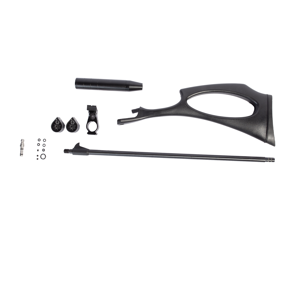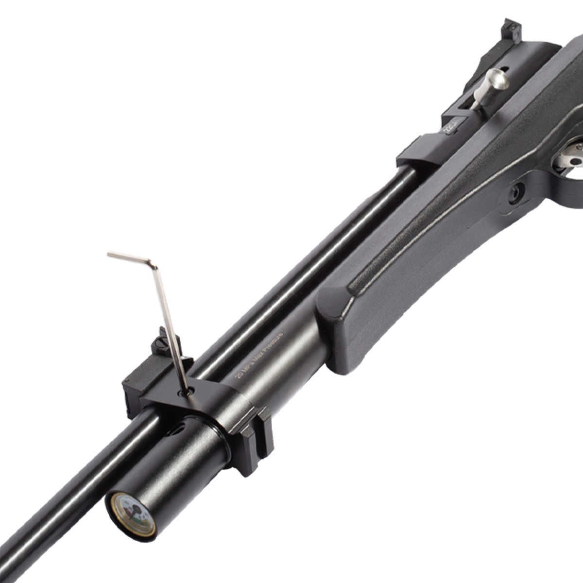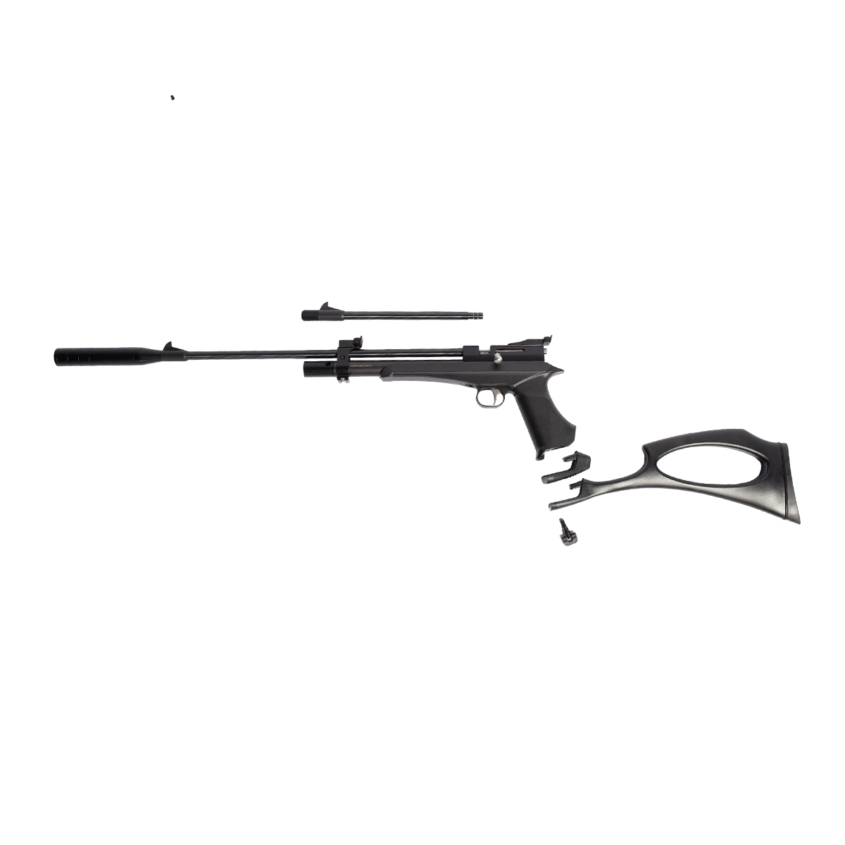 Fabricada em polímero de alta densidade na cor preta e com detalhes em prata, é uma linda arma de pressão PCP.