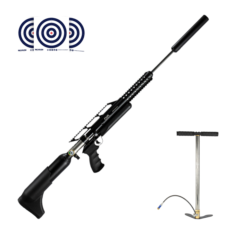 Acompanha uma Bomba Manual PCP 300 Bar para enchimento do cilindro da sua carabina e Alvos de Treino Rossi.