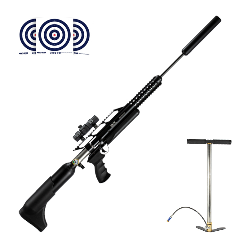 Ela acompanha uma Bomba Manual PCP 300 bar FXR para recarga do cilindro de ar, Red Dot T1 1x30 Thunder Outdoors para melhora no desempenho de mira e Alvos de Treino Rossi.