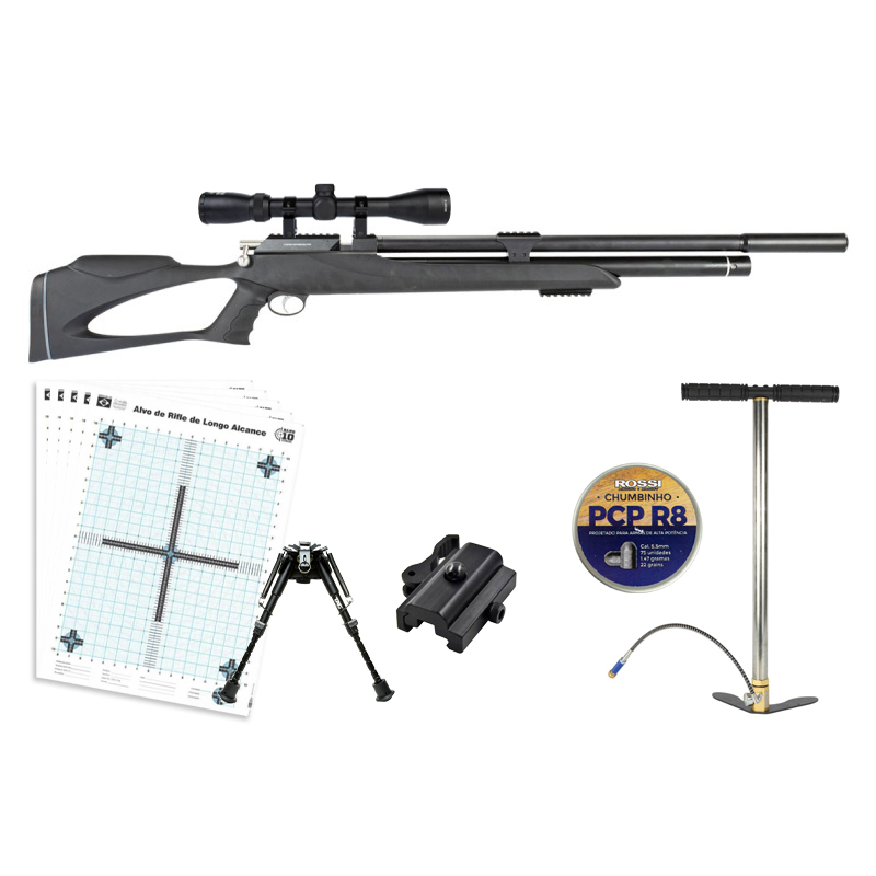CARABINA PCP THUNDER BLACK 5.5MM + CHUMBINHO + BOMBA MANUAL + LUNETA 3-9X40 + ALVOS + ADAPTADOR + BIPÉ