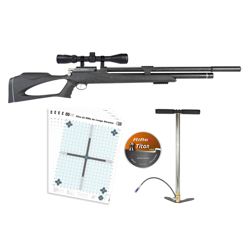 CARABINA PCP THUNDER BLACK 7.62MM + CHUMBINHO + BOMBA MANUAL + LUNETA 3-9X40 + ALVOS