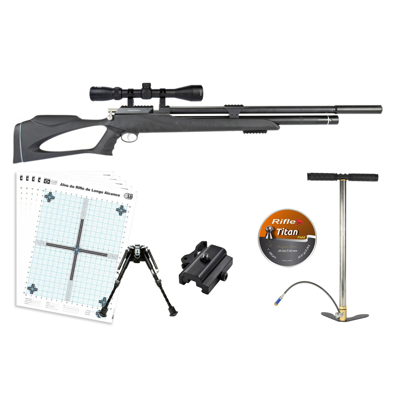 CARABINA PCP THUNDER BLACK 7.62MM + CHUMBINHO + BOMBA MANUAL + LUNETA 3-9X40 + ALVOS + ADAPTADOR + BIPÉ