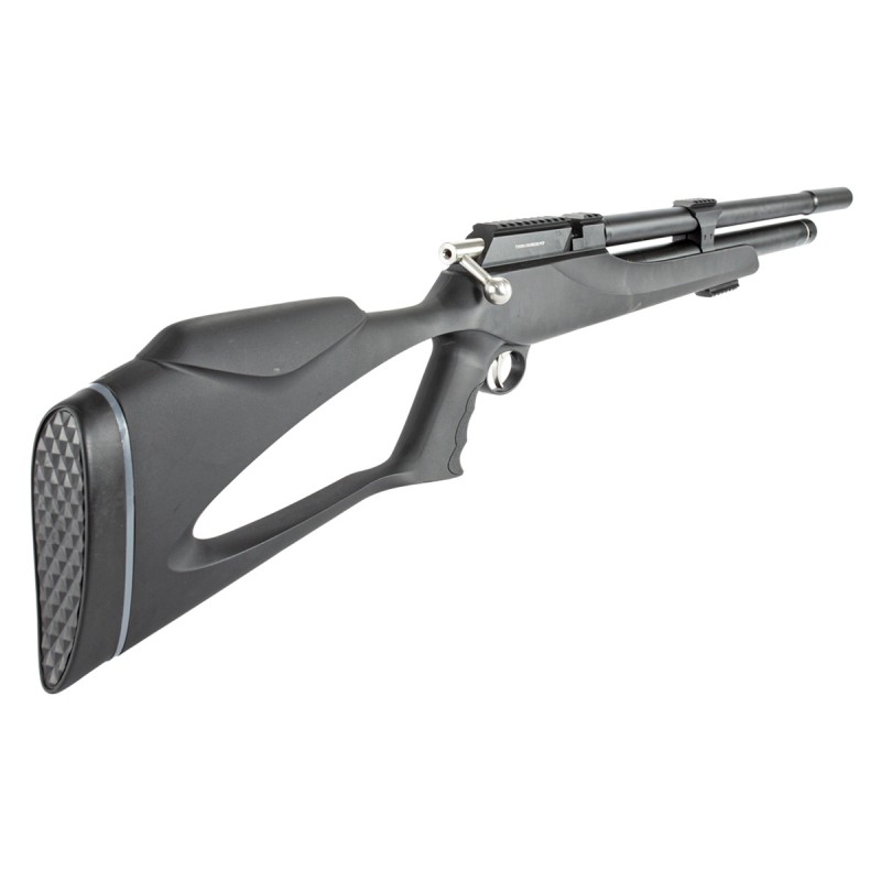 Essa monstruosidade de carabina conta com sistema de disparo PCP atingindo os 244 m/s (800 fps) utilizando chumbinho 9mm como munição, ainda com uma autonomia de 60 disparos.