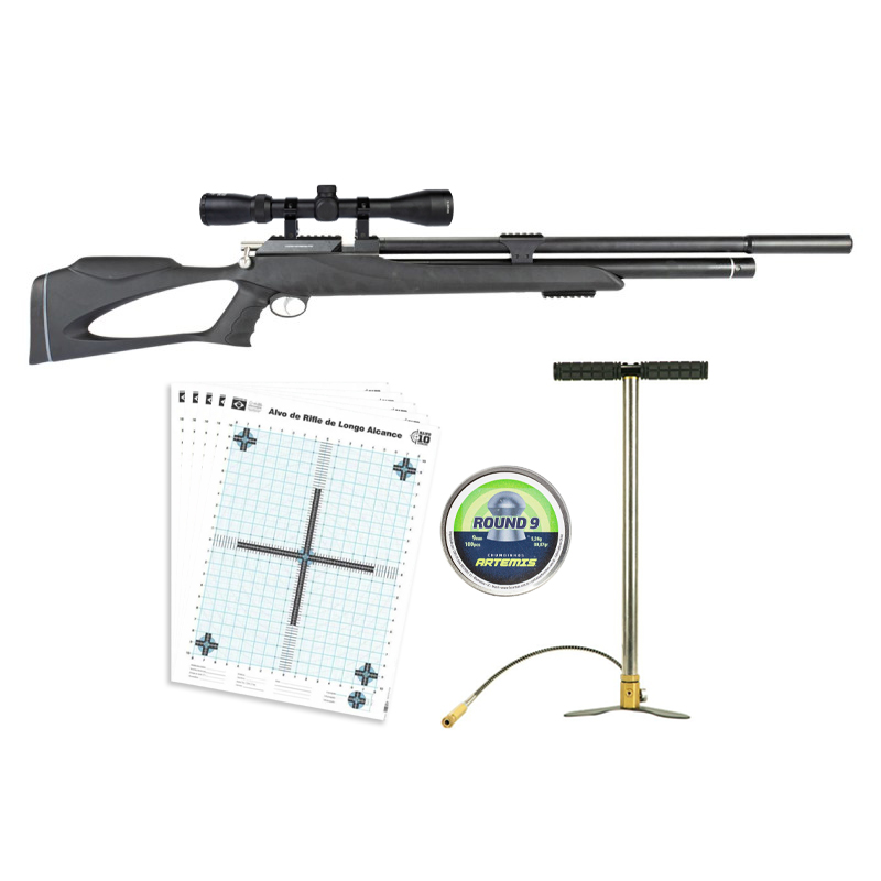 CARABINA PCP THUNDER BLACK 9MM + CHUMBINHO + BOMBA MANUAL + LUNETA 3-9X40 + ALVOS + ADAPTADOR + BIPÉ