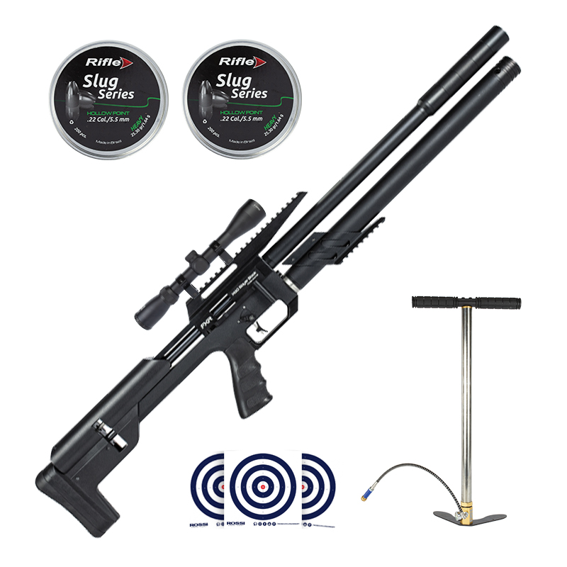 Acompanha uma Luneta 3-9x40 para melhorar o desempenho de mira, Bomba Manual para encher o cilindro da sua PCP, Chumbinhos Slug para municiar sua carabina e Alvos de Treino Rossi.