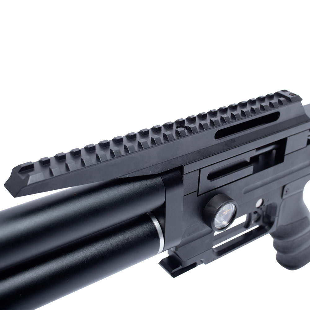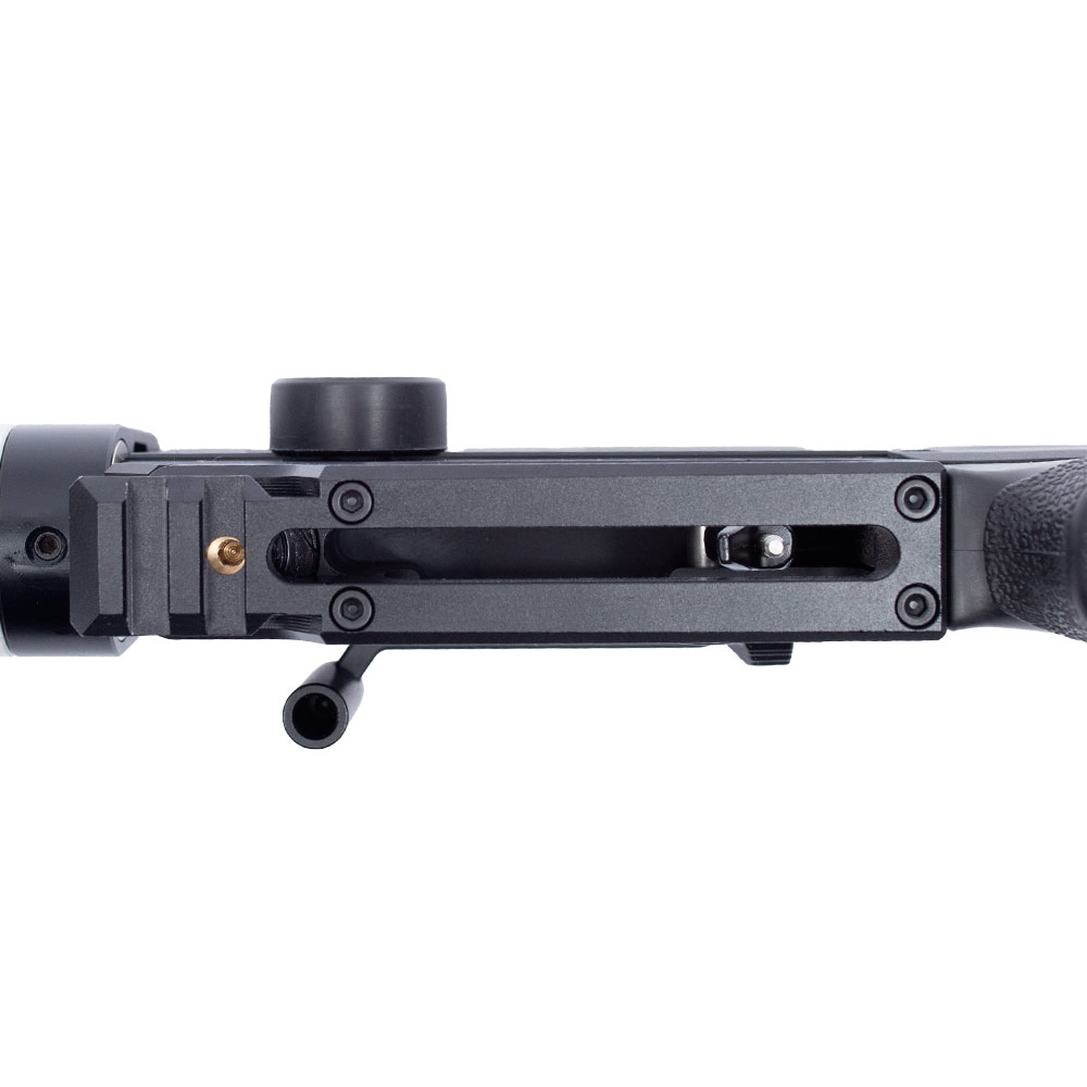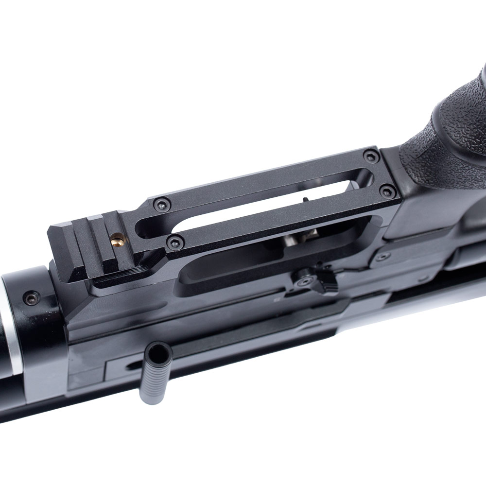 Essa é uma Carabina PCP (Pre Charged Pneumatic) com engatilhamento side lever, ou seja, por alavanca lateral e que dispara em modo Multishot utilizando magazine rotativo.