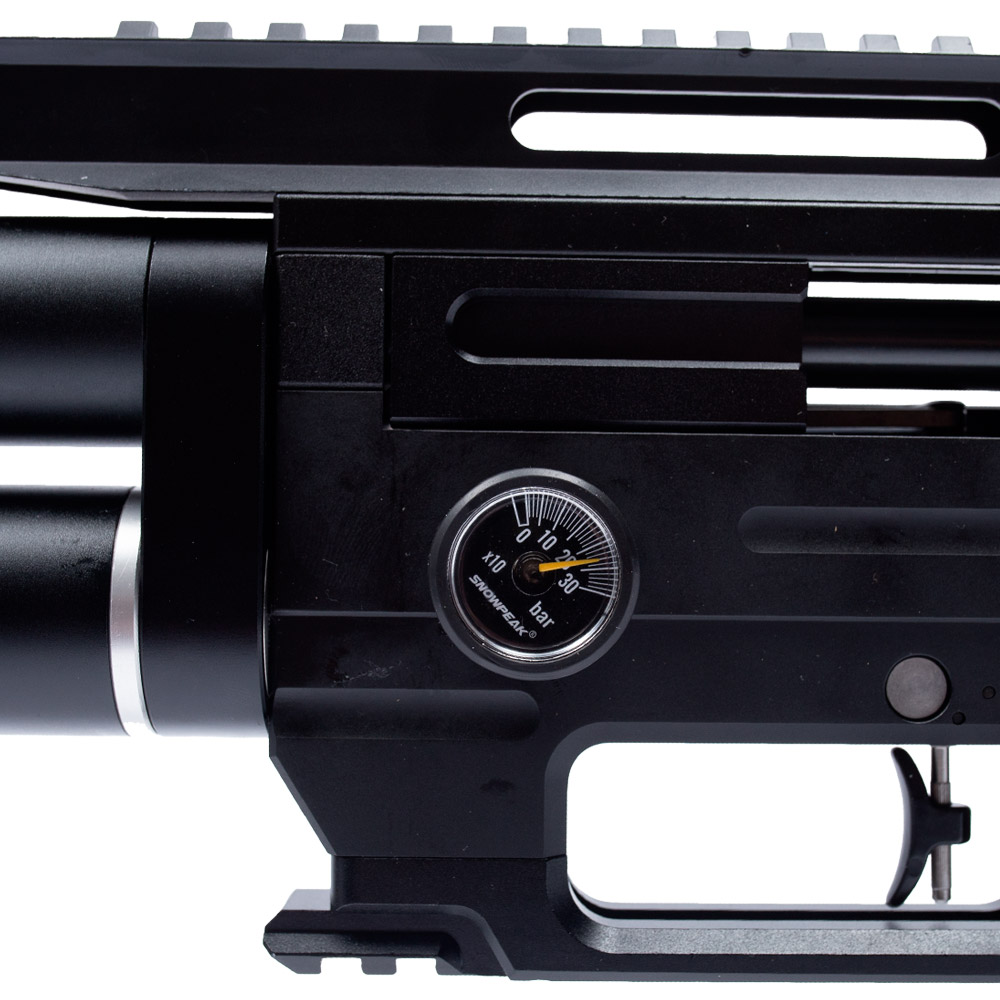 Trabalha com pressão máxima de 300 Bar (30 MPa) e entrega uma autonomia de aproximadamente 70 disparos com velocidade ideal.