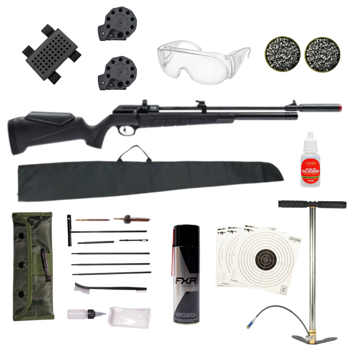 O conjunto inclui ainda chumbinhos 5.5 mm, porta chumbinhos almofadado para transporte seguro, alvos de papel para treino, além de uma capa para carabina, ideal para transporte e armazenamento com proteção contra impactos e poeira.