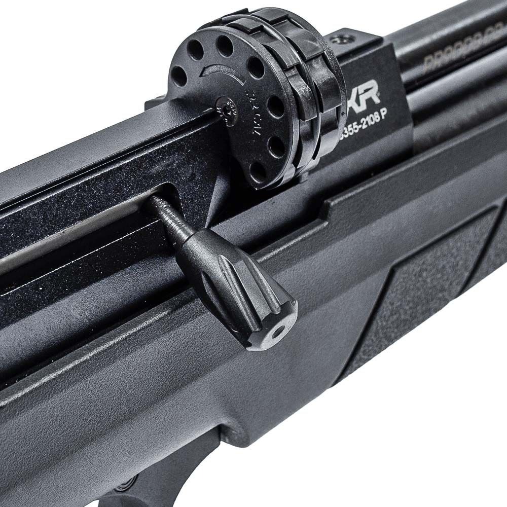 A carabina opera nos modos multishot, através de magazine rotativo com capacidade para 10 chumbinhos, e monotiro, por meio do adaptador incluso. O gatilho estilo match, ajustável e construído em metal, oferece controle refinado do disparo, enquanto a trava de segurança manual, integrada ao guarda-mato, garante maior segurança durante o manuseio.
