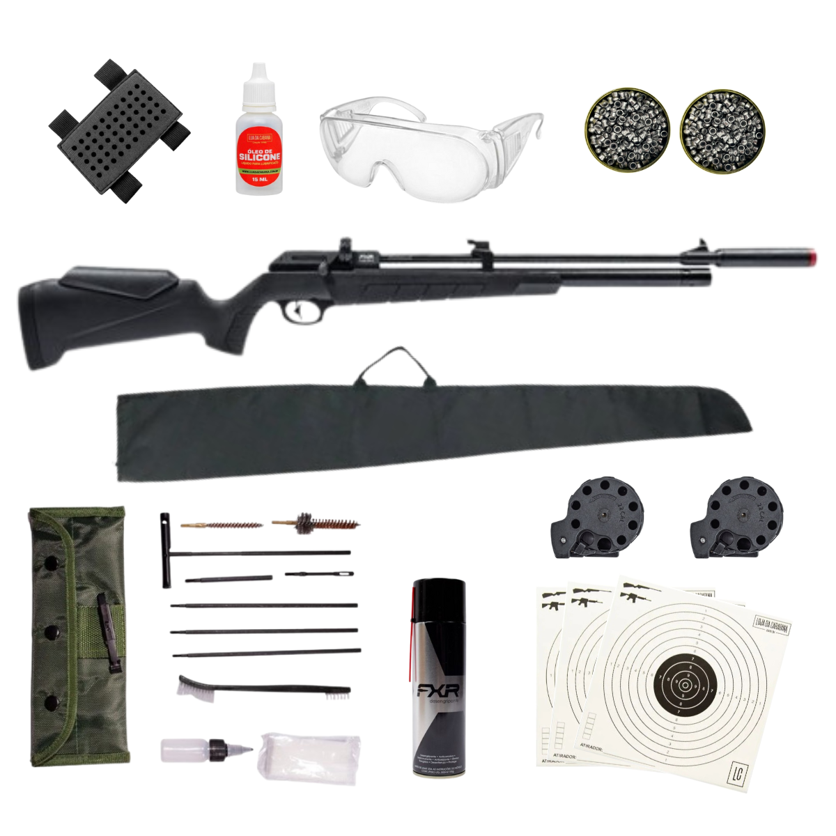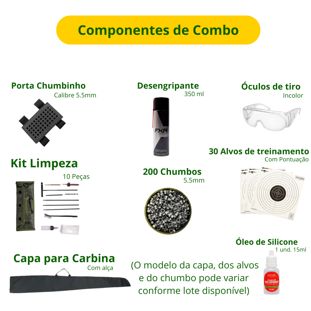 O conjunto inclui ainda 200 chumbinhos 5.5 mm, porta chumbinhos almofadado para transporte seguro, alvos de papel para treino, além de uma capa para carabina, ideal para transporte e armazenamento com proteção contra impactos e poeira.