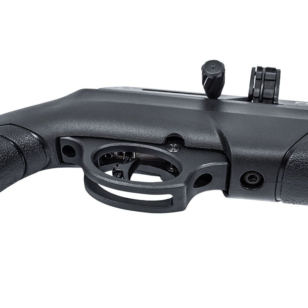 A carabina opera nos modos multishot, através de magazine rotativo com capacidade para 10 chumbinhos, e monotiro, por meio do adaptador incluso. O gatilho estilo match, ajustável e construído em metal, oferece controle refinado do disparo, enquanto a trava de segurança manual, integrada ao guarda-mato, garante maior segurança durante o manuseio.
