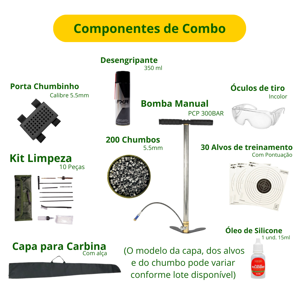 O conjunto é complementado por chumbinhos 5.5 mm, porta chumbinhos almofadado para transporte seguro, alvos de papel para treino, além de uma capa para carabina, ideal para armazenamento e transporte protegidos contra impactos e poeira.