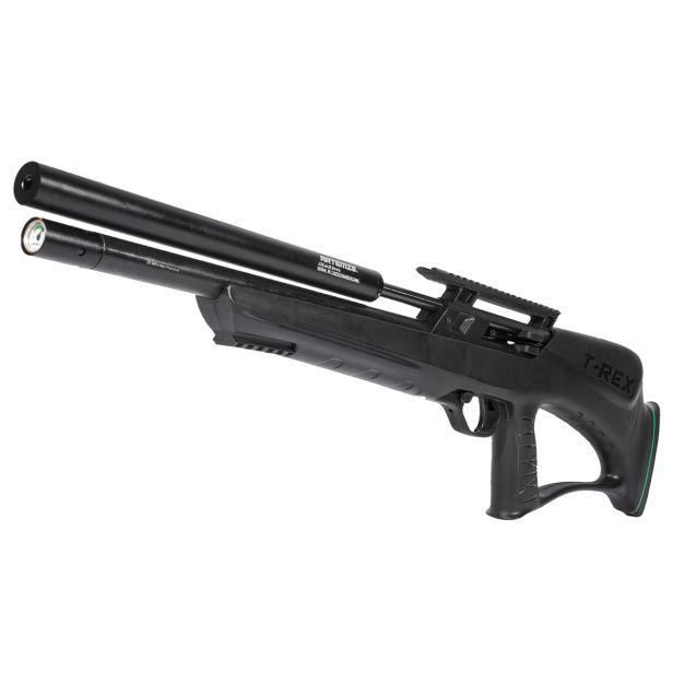Seu funcionamento é multishot, com engatilhamento por ferrolho lateral suave e eficiente. O modelo acompanha dois magazines rotativos de 11 tiros, garantindo praticidade e rapidez nos disparos. Para garantir estabilidade e constância, a T-Rex possui válvula reguladora, cano em aço de 480 mm com excelente precisão e supressor embutido para redução de ruído. Sua coronha conta com apoio de bochecha ajustável, soleira emborrachada e ergonomia pensada para conforto total do atirador. Além disso, traz trilhos Picatinny superior e inferior para instalação de luneta, red dot, bipé, lanternas e outros acessórios.