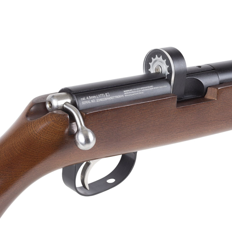 Carabina PCP Multishot e com modo de engatilhamento por ferrolho lateral (Bolt action).