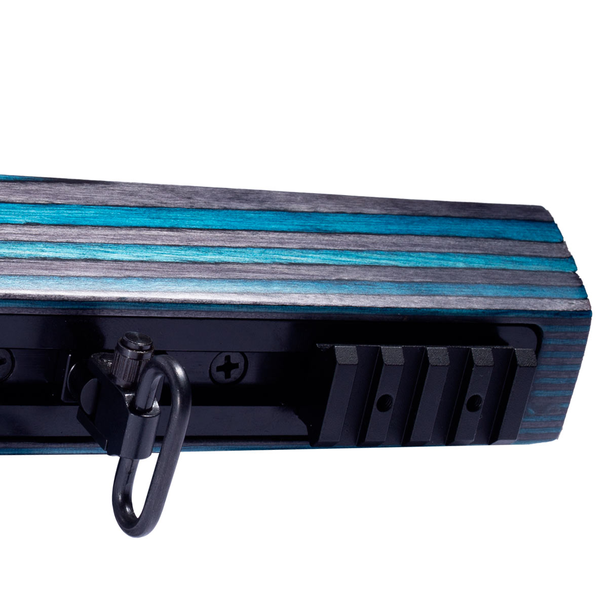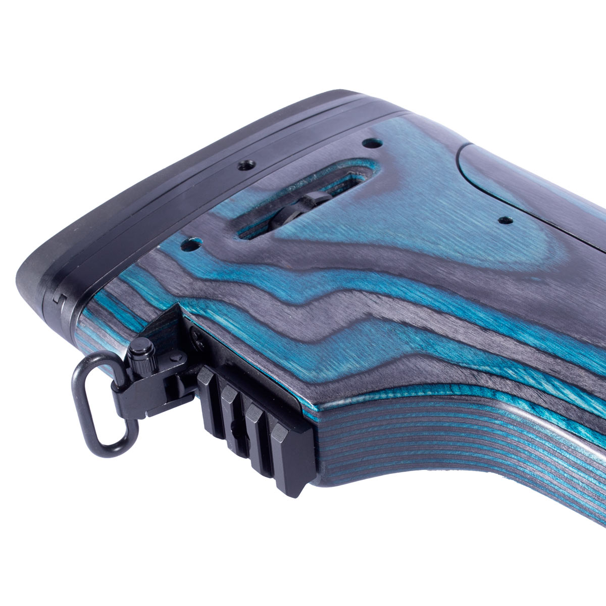 Sua coronha é estilo tático e ambidestra. Fabricada em madeira nogueira turca com laminado azul, entregando um visual único e moderno além de resistência e alta durabilidade.