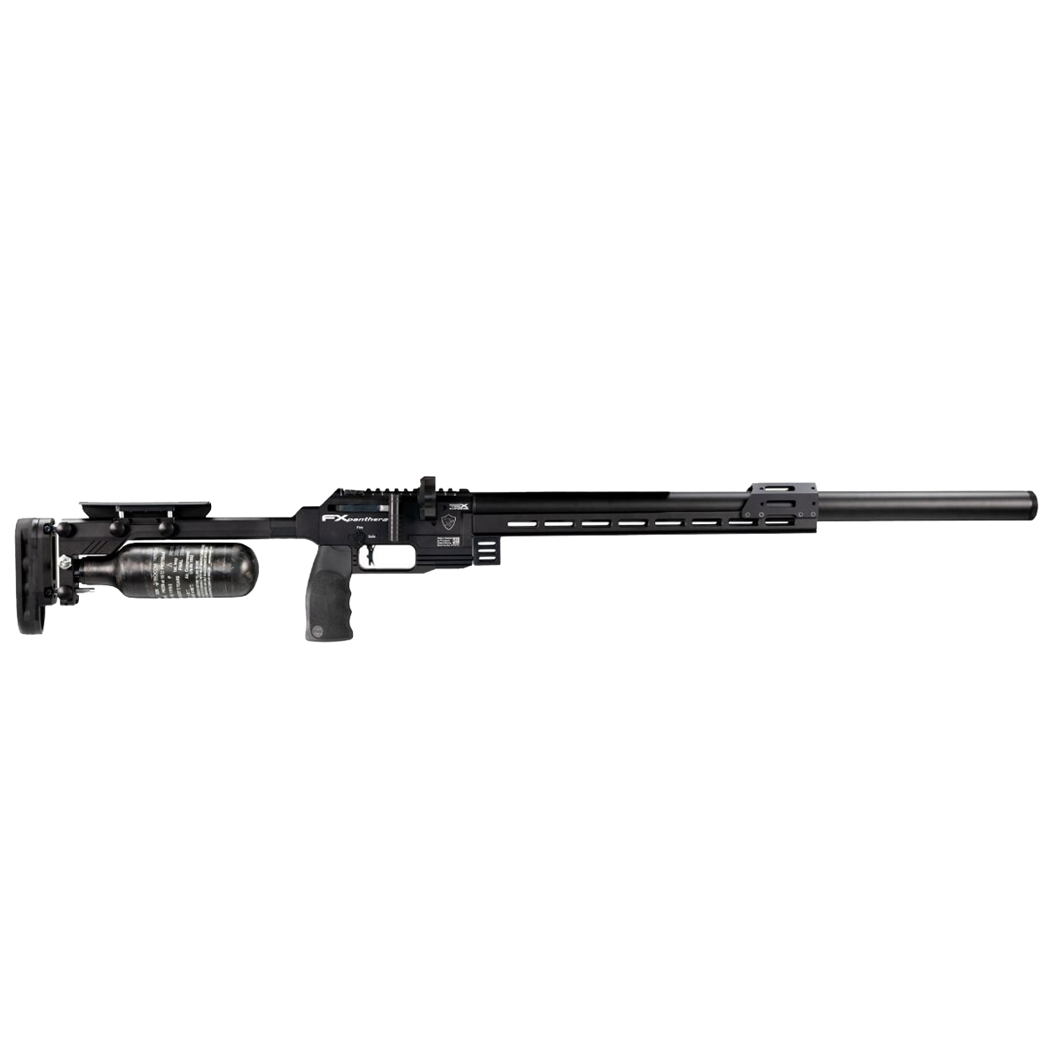 O projeto da coronha é pensado para competição, com ajuste total de ergonomia, bochecha ambidestra ajustável, trilho Arca de comprimento estendido com seções M-LOK para acessórios e ponto de barricada, possibilitando balanceamento com pesos externos ou internos. A alimentação deep-feed aceita projéteis longos de até 13 mm e o bloco maior permite o uso de munições pesadas. A fonte de ar é uma garrafa traseira de fibra de carbono de alta capacidade (300 cc) com conexão Foster, enquanto os manômetros angulados mostram em tempo real a pressão da garrafa e do plenum regulado. A Panthera ainda traz trilho Picatinny com 20 MOA de fábrica, alavanca de armamento lateral reversível e opções de quick tune e personalização de gatilho e plenums.