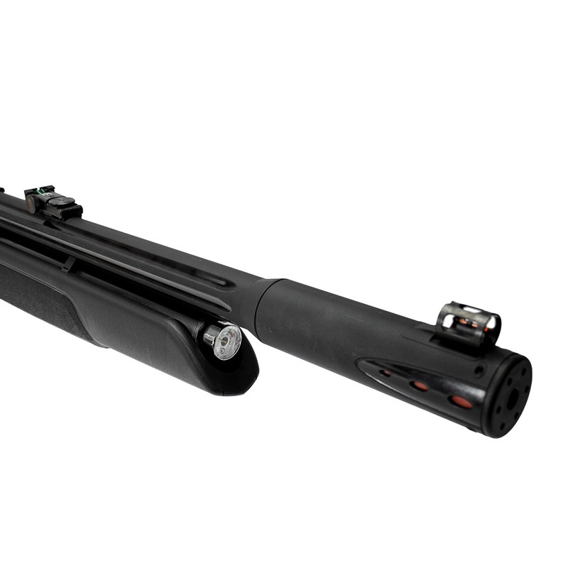Acompanha moderador de ruído Gamo Whisper Fusion, onde o projétil percorre duas câmaras diferentes, comprimindo e prevenindo a expansão do ruído.