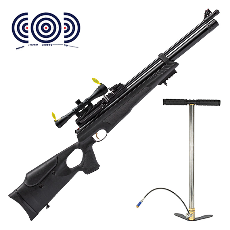 Mega combo contendo Bomba Manual PCP 300 BAR para preencher o cilindro da sua carabina, Luneta 4x32 Flash para aprimorar a precisão da sua carabina e Alvos de Treino Rossi.
