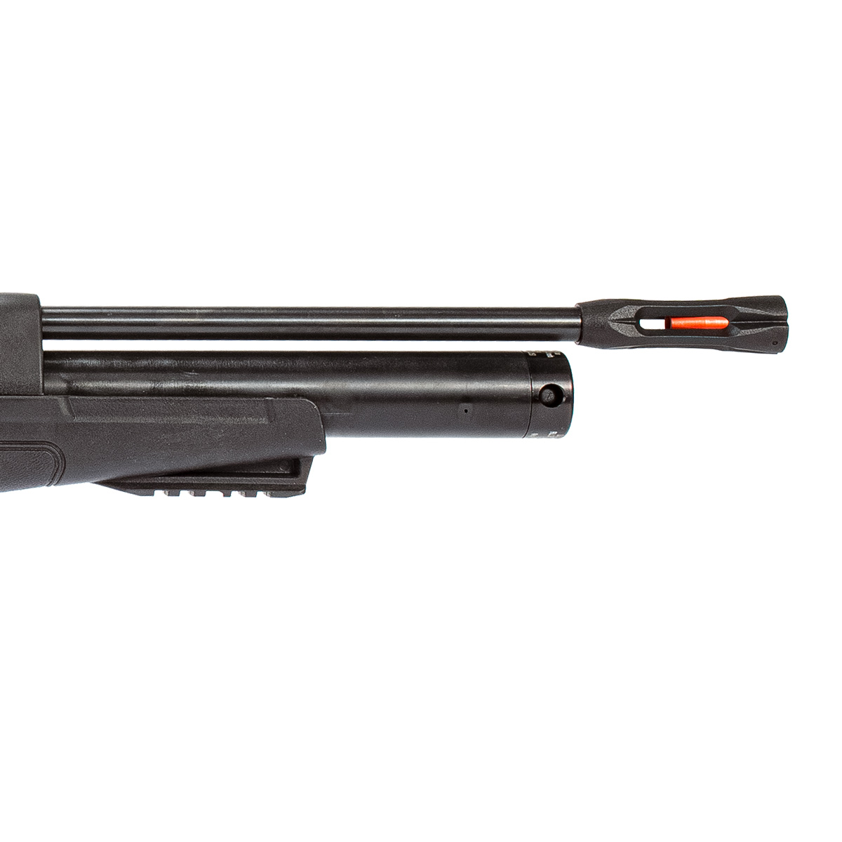 O cilindro de ar da Hatsan Flash tem capacidade de ar de 215 cc e trabalha em uma pressão máxima de 200 bar e mínima de 70 bar.