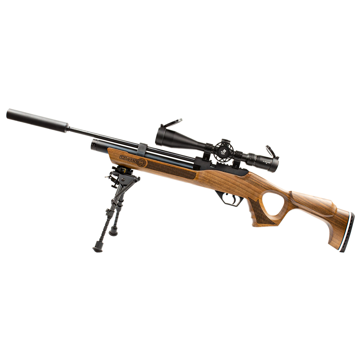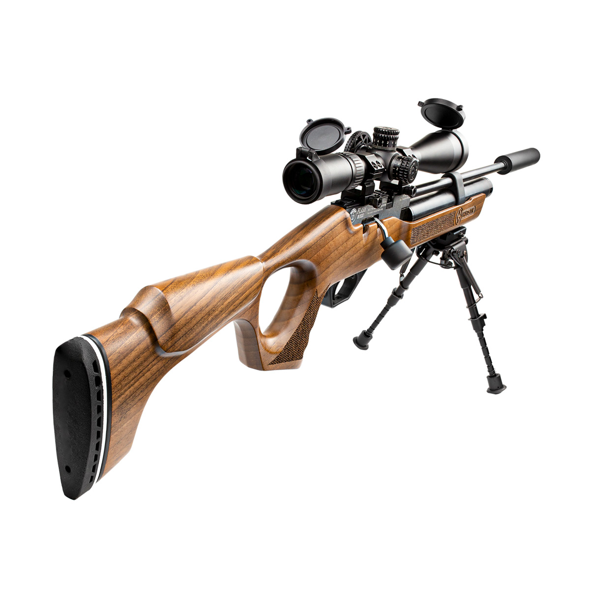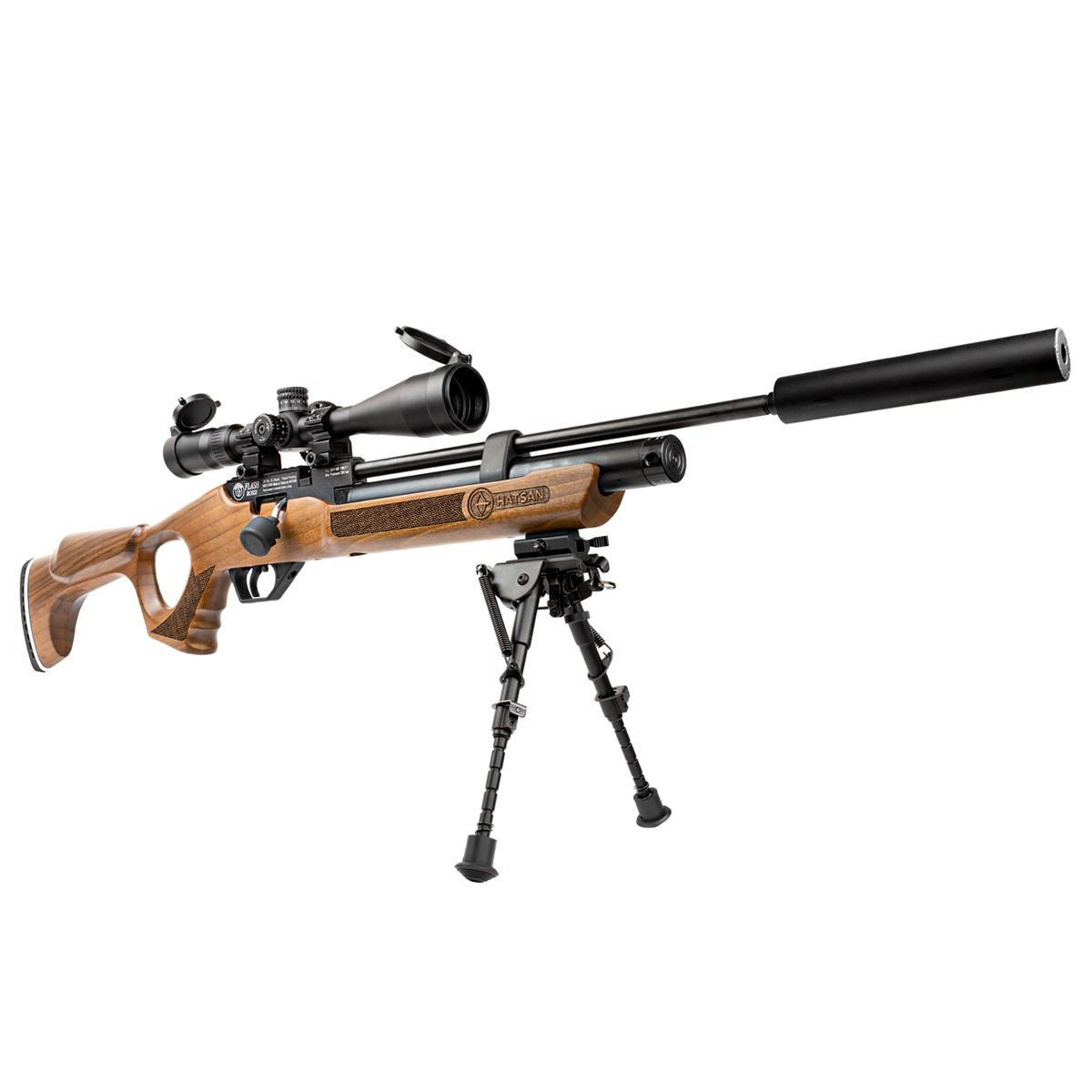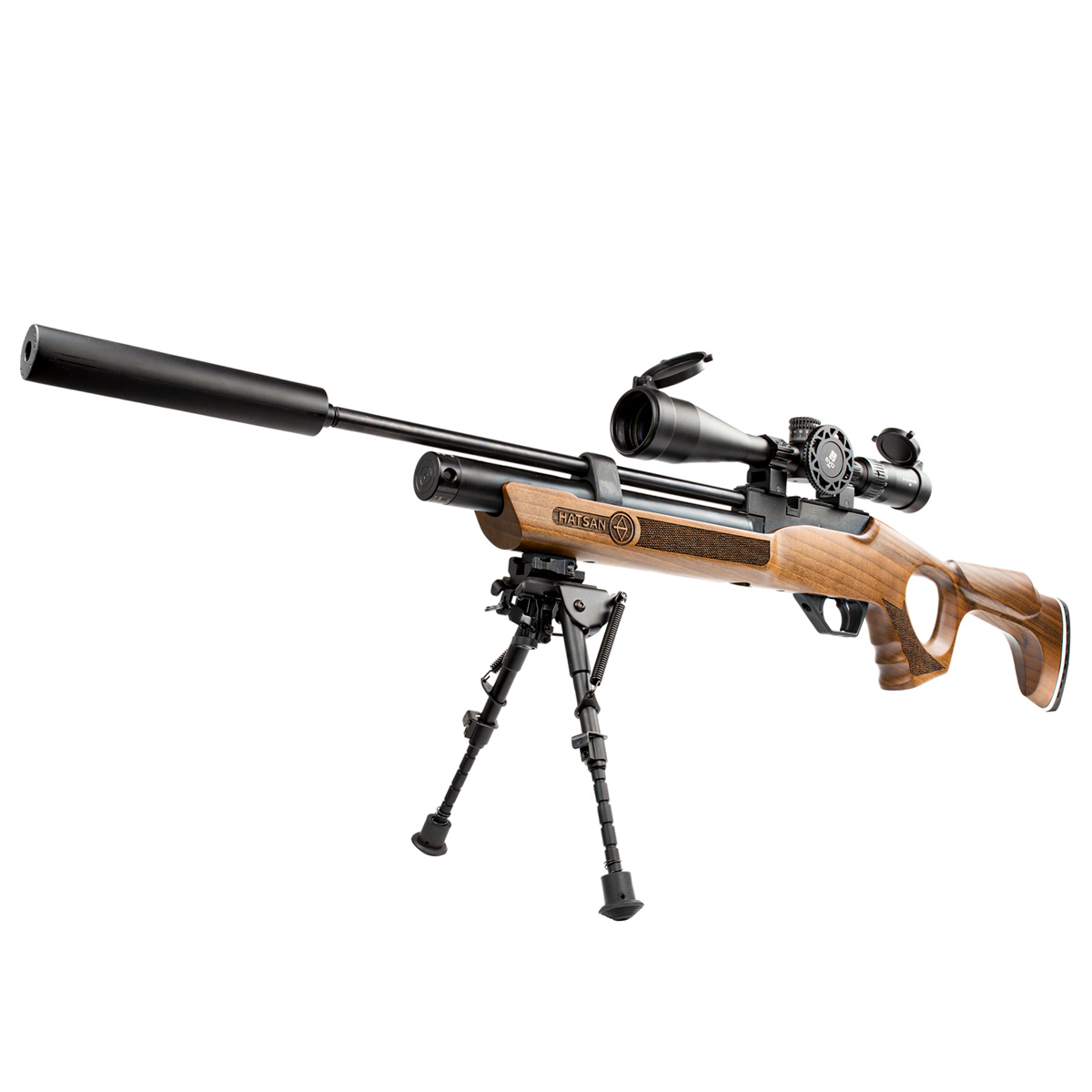 A Carabina Hatsan 6.35 Flash PCP acompanha um supressor de ruídos funcional e também um bipé harris em metal juntos vão oferecer disparos de maior precisão e silenciosos.