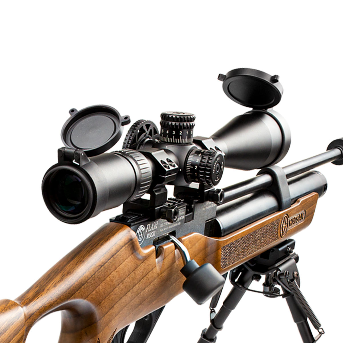 Carabina de Pressão PCP Hatsan Flash no calibre 6.35mm, com coronha em madeira, tem um belíssimo visual, aliado a alta precisão e potência! Tem uma velocidade de 265m/s*. Seu engatilhamento é por ferrolho lateral.