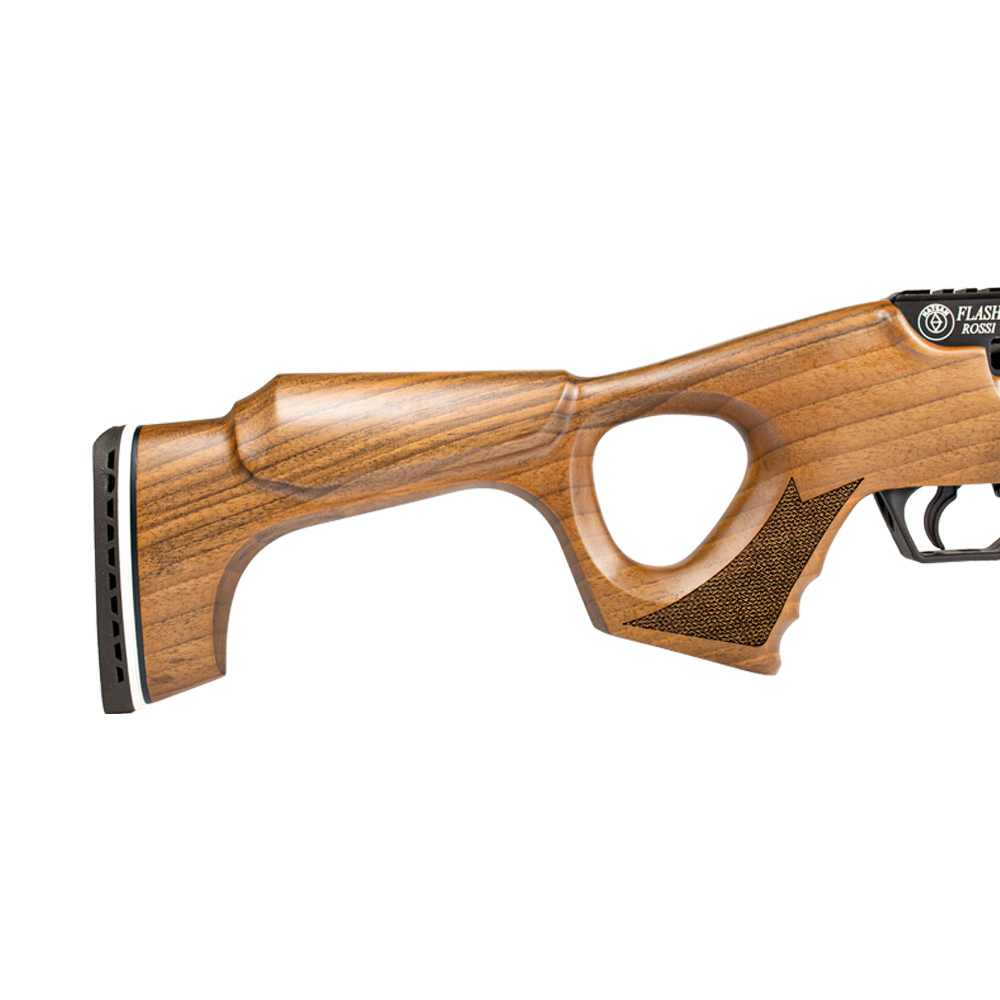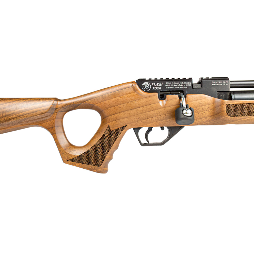 Carabina PCP (Pré Charged Pneumatic) Flash com Coronha em madeira natural é fabricada pela Hatsan no calibre 6.35mm. Altamente precisa e confortável! Esta Carabina 6.35 os seus disparos chegam a uma velocidade de 265m/s*.