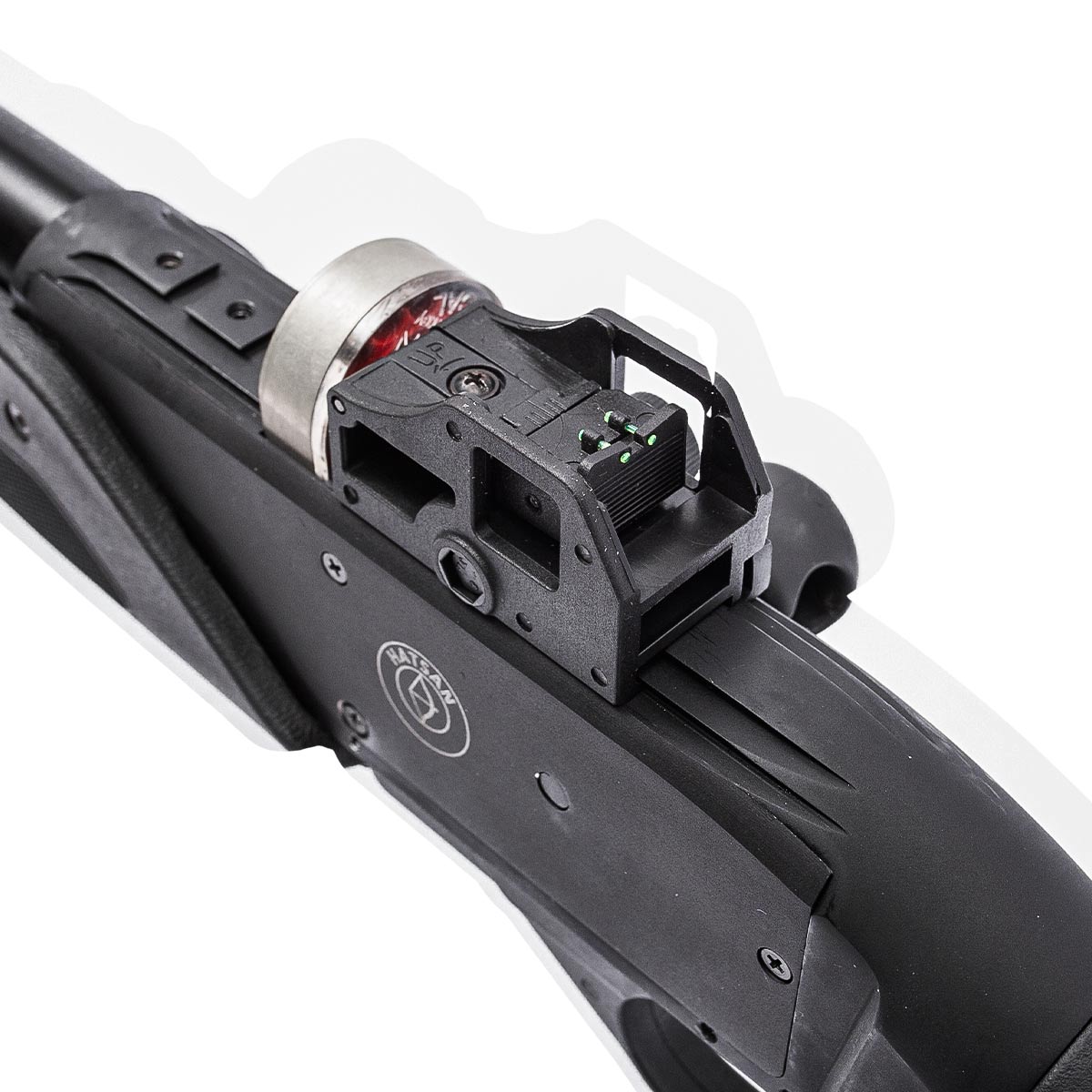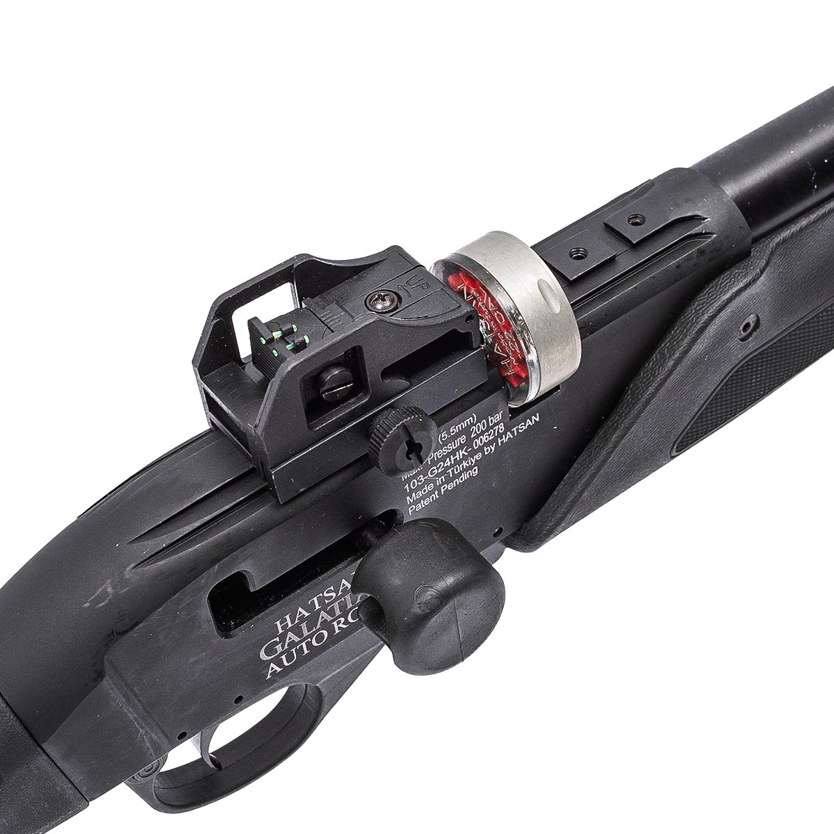 A Hatsan Galatian Auto, possui trilho superior estilo rabo de andorinha de 11 mm onde você poderá instalar a sua luneta de forma rápida e segura. Também possui trilhos laterais e um inferior picatinny de 20 mm para uso de bipé, grip, lanternas e outros acessórios.