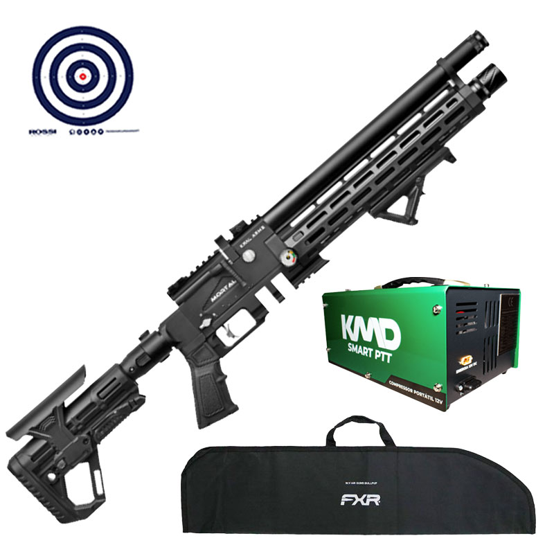 Combo feito pela LC contém Compressor de ar KMD para enchimento do cilindro da sua PCP, Capa para Carabina para transportas e armazenar sua carabina e Alvos de Treino Rossi.