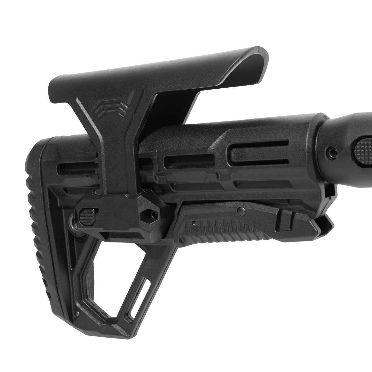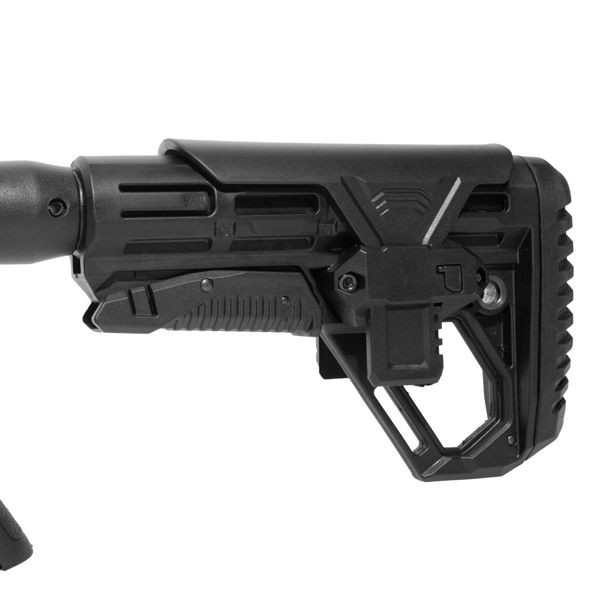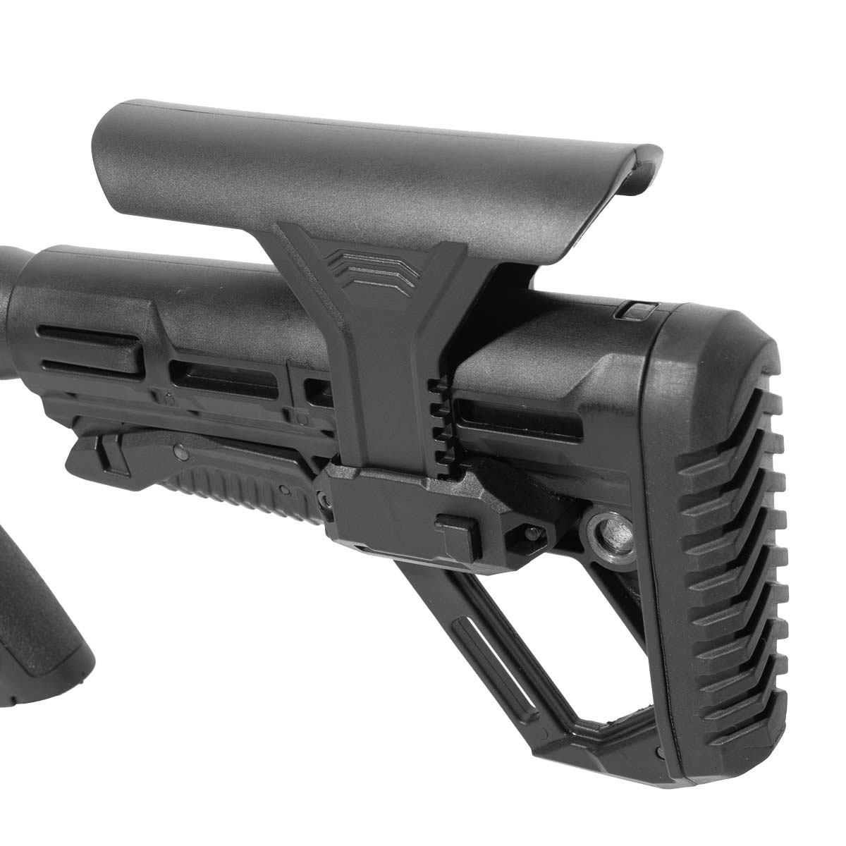Coronha retrátil que permite ajustar o tamanho total da carabina conforme a sua preferência. Seu comprimento pode ser ajustado de 84 cm até 92 cm no total.