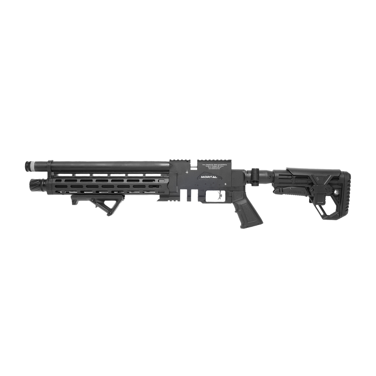 A coronha da Mortal X Tactical é rebatível, ela te garante mais mobilidade em ambientes confinados e da um visual mais tático para a carabina.