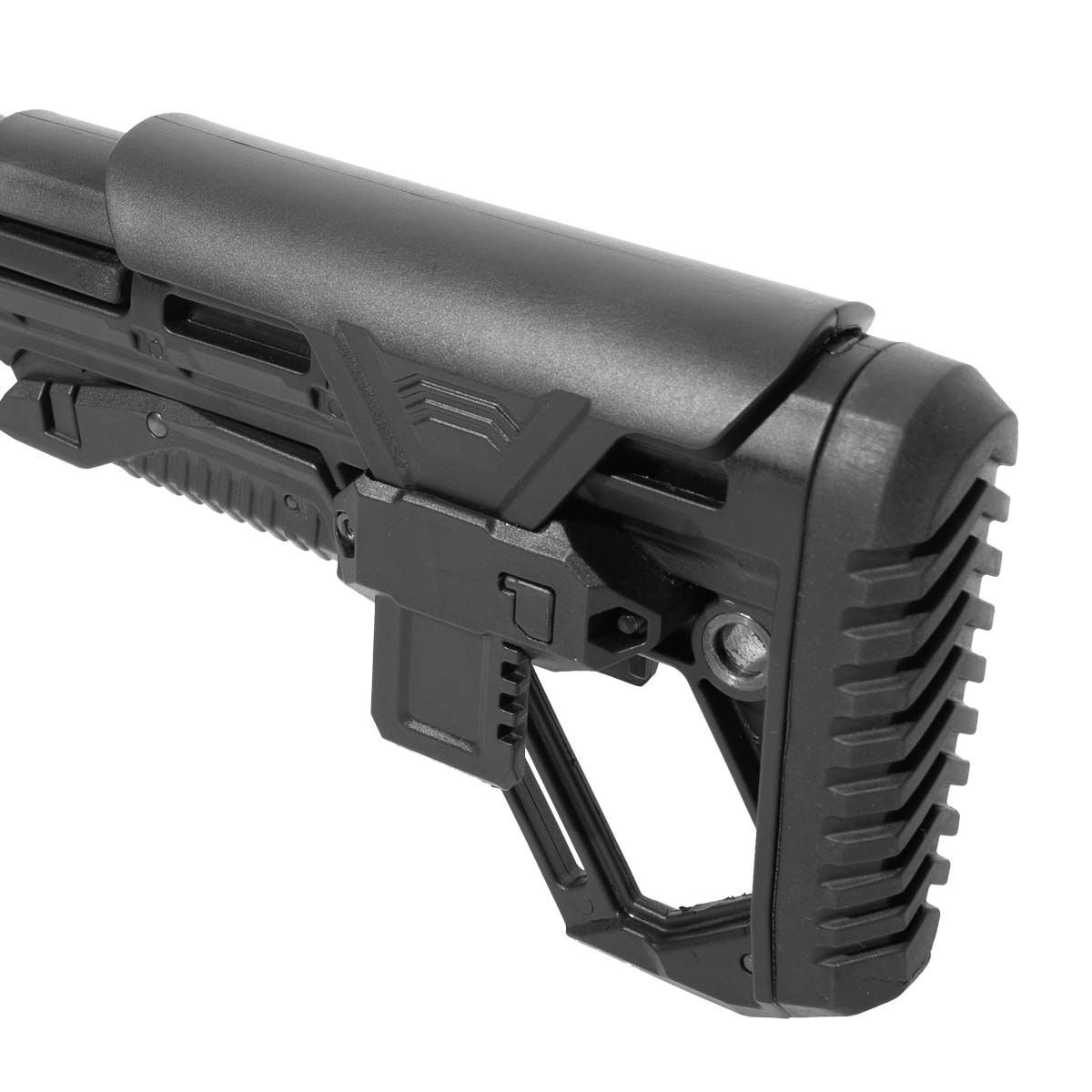 Coronha retrátil que permite ajustar o tamanho total da carabina conforme a sua preferência. Seu comprimento pode ser ajustado de 84 cm até 92 cm no total.