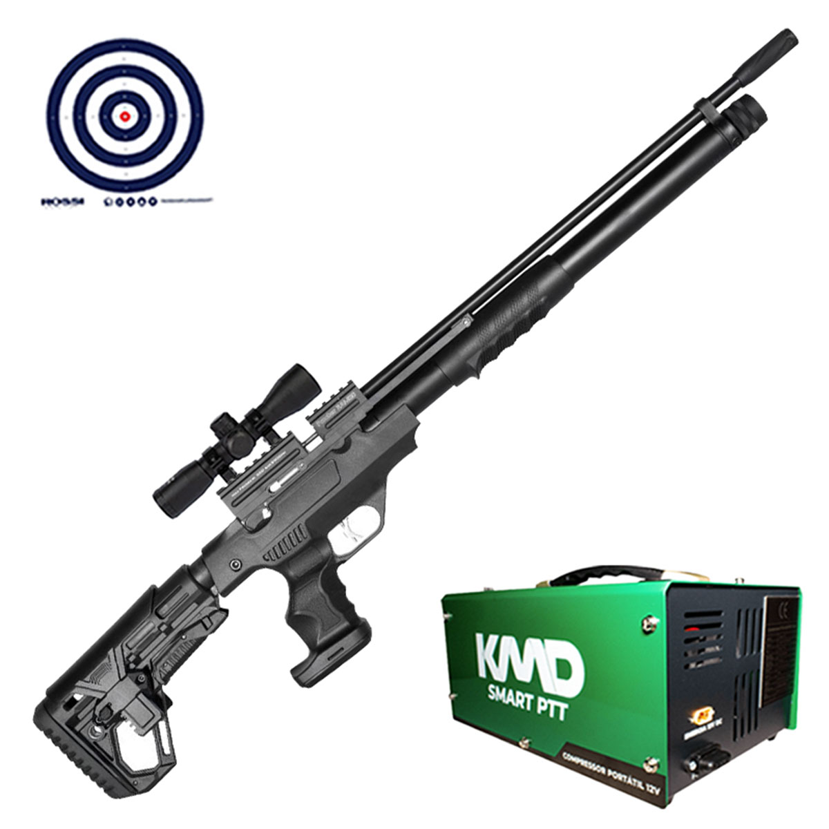Carabina PCP Puncher Rambo S Kral Arms Pump 5.5mm + Compressor de AR KMD + Luneta 3-9x40 + Alvos