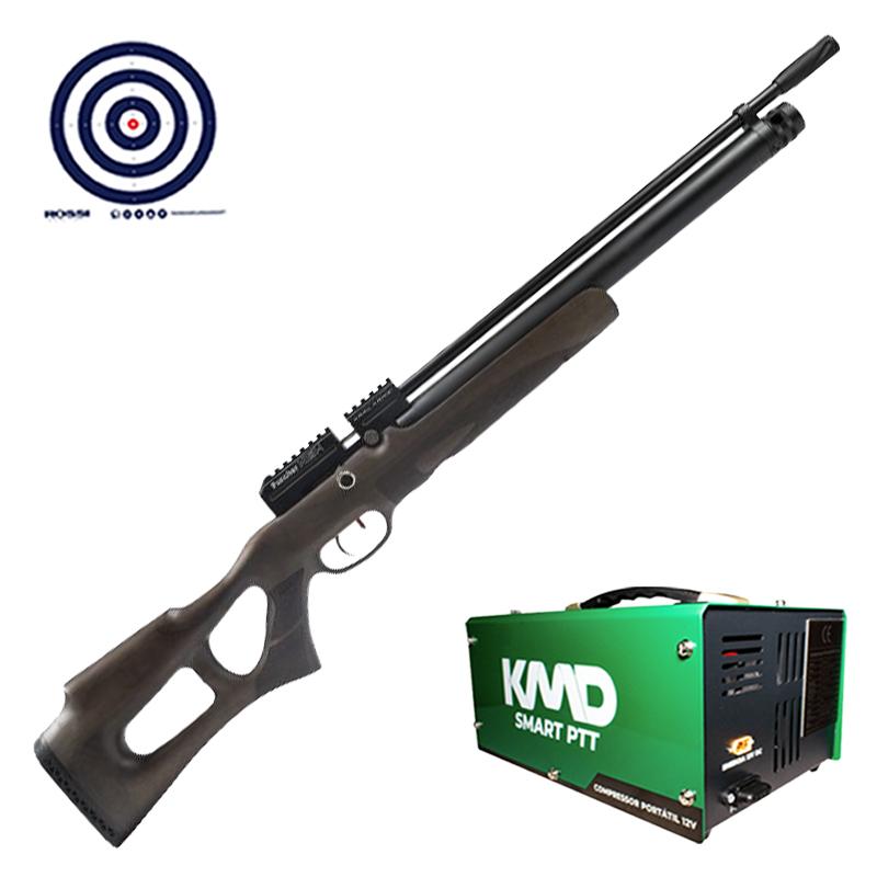 O kit inclui ainda o compressor de ar KMD, compacto e bivolt, com potência de 350 W, sistema de refrigeração por ventilação, compatibilidade com alimentação 12 V e mangueira de alta pressão com kit de reparos. Pesa cerca de 7,3 kg e tem dimensões que facilitam o transporte e o uso em campo ou em casa, oferecendo uma forma prática e rápida de recarregar o cilindro da sua PCP sem esforço manual. Para fechar o conjunto, o pacote traz 30 alvos descartáveis Rossi 14x14 cm, perfeitos para treino de pontaria e diversão. Compra com nota fiscal e envio para todo o Brasil.