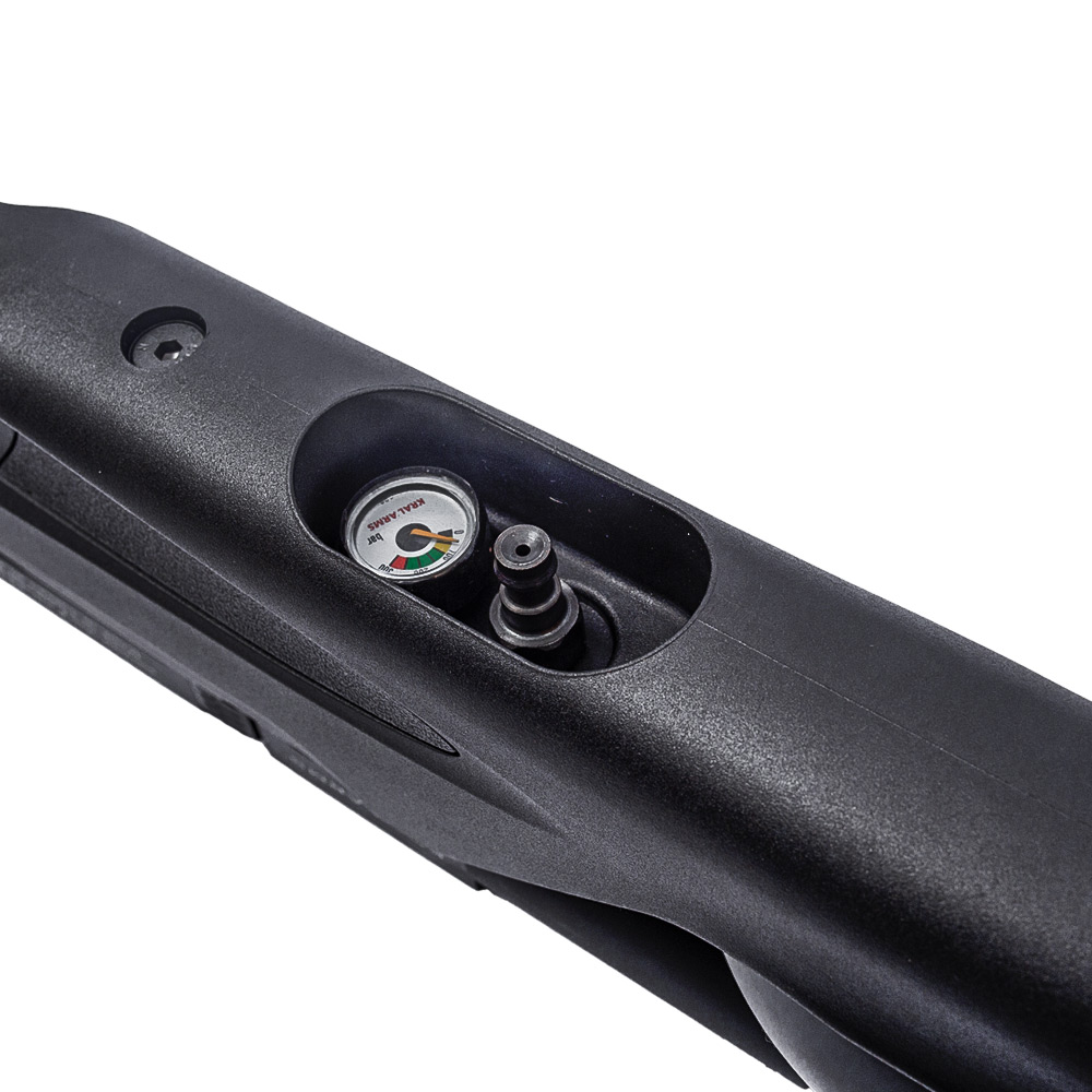 Equipada com um cilindro de ar de alta capacidade (500 cc), fabricado em alumínio aeronáutico que oferece uma autonomia de aproximadamente 144 disparos.