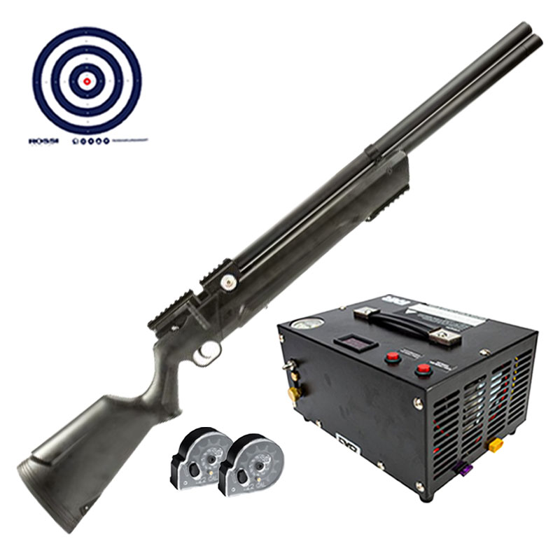 ronto para sair do zero e cair no campo de tiro com total praticidade. Este kit reúne a leveza e a potência da Carabina PCP Nova Vista Leviathan PS-P em calibre 5,5 mm com um compressor portátil que facilita e agiliza suas recargas. A Leviathan PS-P entrega 35 joules de energia, cilindro de 140 ml e pressão de trabalho de até 250 bar, tudo em um conjunto muito leve de apenas 2,1 kg que facilita transporte e manuseio. O engatilhamento por alavanca lateral é ergonômico e preciso, e o magazine rotativo de 10 tiros vem com um extra para reduzir paradas durante a sessão.