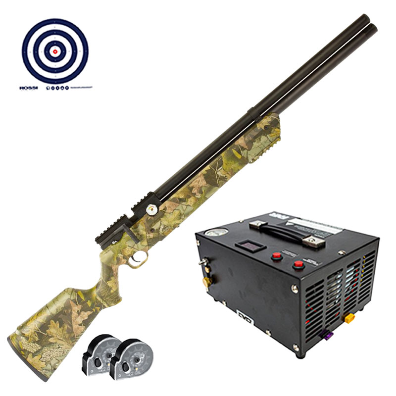 O kit inclui um compressor portátil para PCP com sistema auto-stop, ideal para recargas rápidas e sem esforço quando comparado à bomba manual. O compressor é compacto e fácil de transportar, permitindo encher cilindros em campo com maior praticidade. Também acompanham um magazine sobressalente compatível e um pacote com 30 alvos descartáveis Rossi para treinos imediatos.