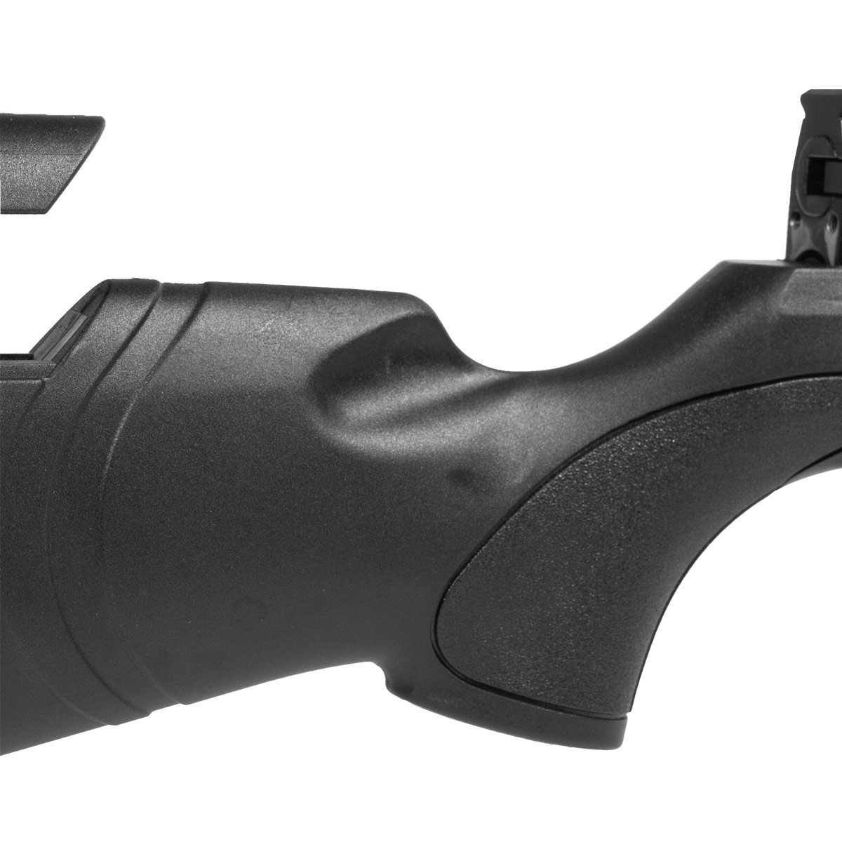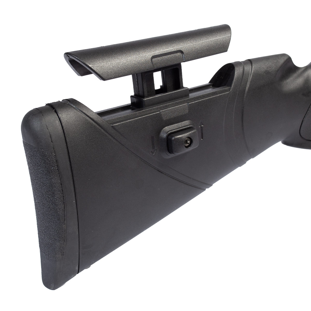 Possui apoio de bochecha ajustável que entrega maior estabilidade e conforto para o atirado nos disparos.
