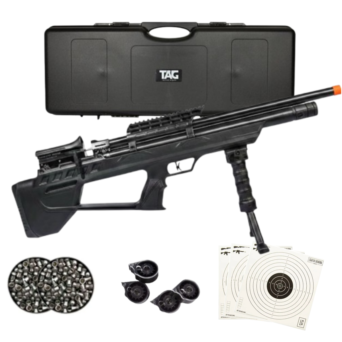 Acompanha ainda case rígida na cor preta, com revestimento interno em espuma, garantindo transporte e armazenamento seguros da carabina e seus acessórios, protegendo contra impactos, poeira e arranhões. O conjunto inclui também chaves, o’rings, bico de enchimento, óleo de silicone e chaveiro personalizado.