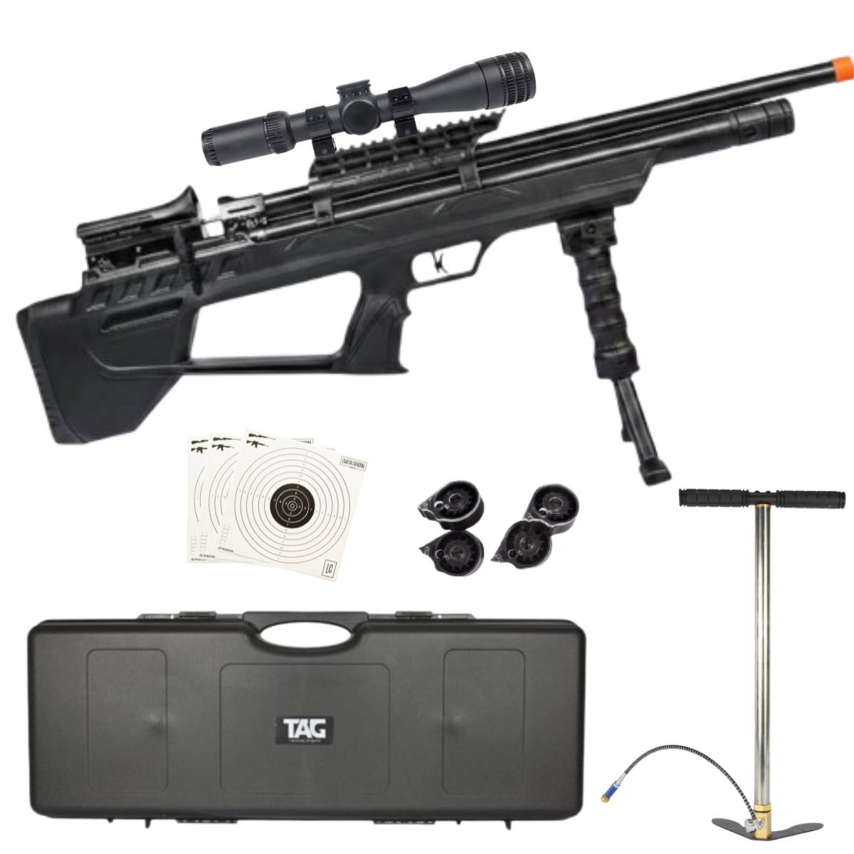 O combo inclui alvos para treino, ideais para prática de tiro esportivo, desenvolvimento de precisão e controle dos disparos. A bomba manual PCP que acompanha o conjunto é equipada com manômetro integrado, mangueira de conexão e pés de apoio fixos, permitindo recargas seguras e eficientes até altas pressões.