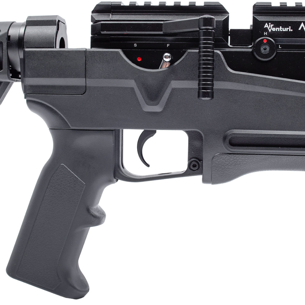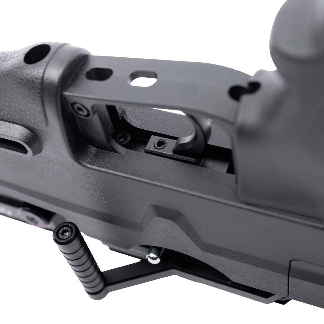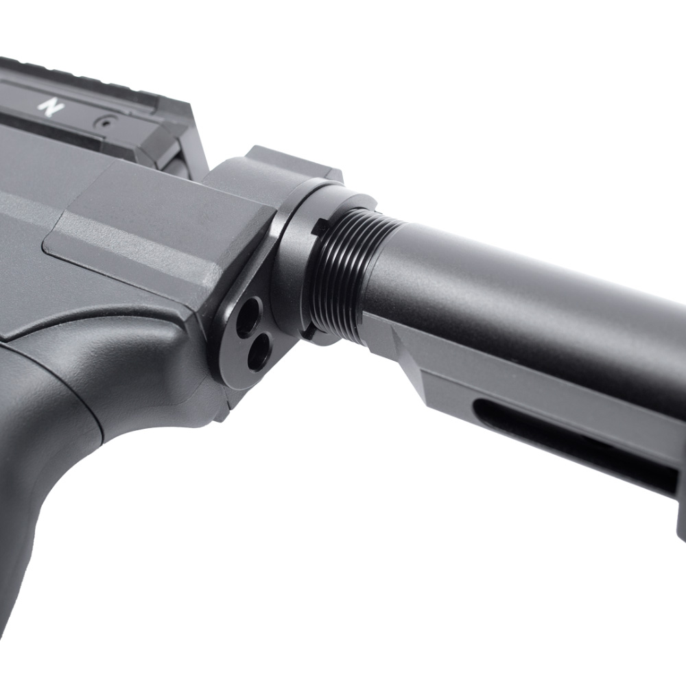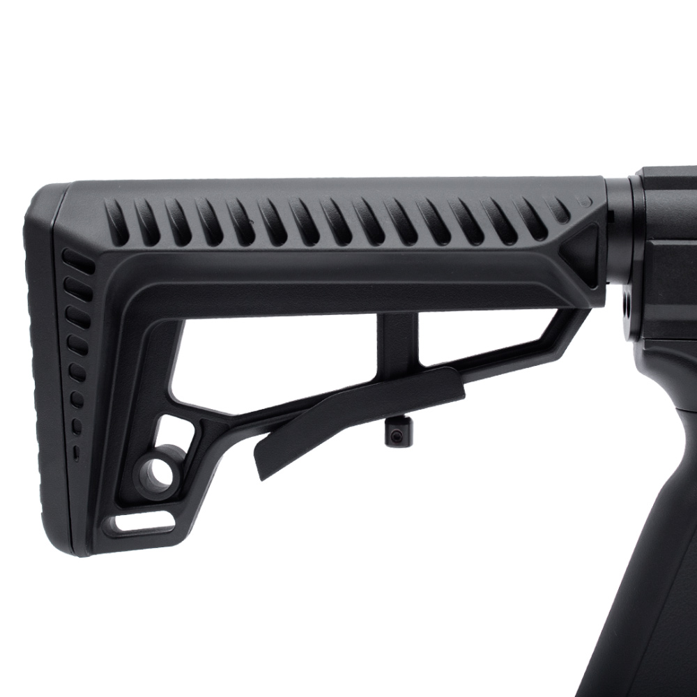 A coronha em polímero preta, com um design tático e ajustável, não só confere à carabina um visual moderno e robusto, mas também proporciona um conforto superior durante o uso.