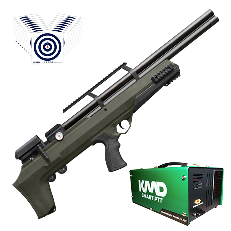 CARABINA PCP 5.5MM BEHEMOTH PS-R2 VERDE MILITAR BULLPUP + COMPRESSOR DE AR KMD + ALVOS ROSSI