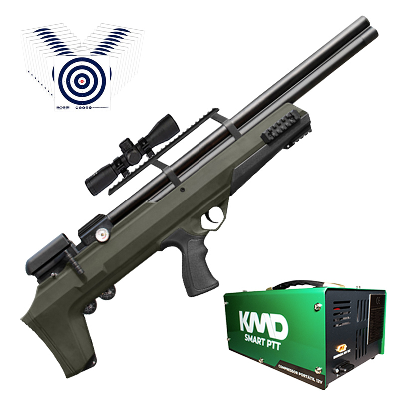CARABINA PCP 5.5MM BEHEMOTH PS-R2 VERDE MILITAR BULLPUP + COMPRESSOR DE AR KMD + LUNETA 4X32 + ALVOS DE TREINO ROSSI