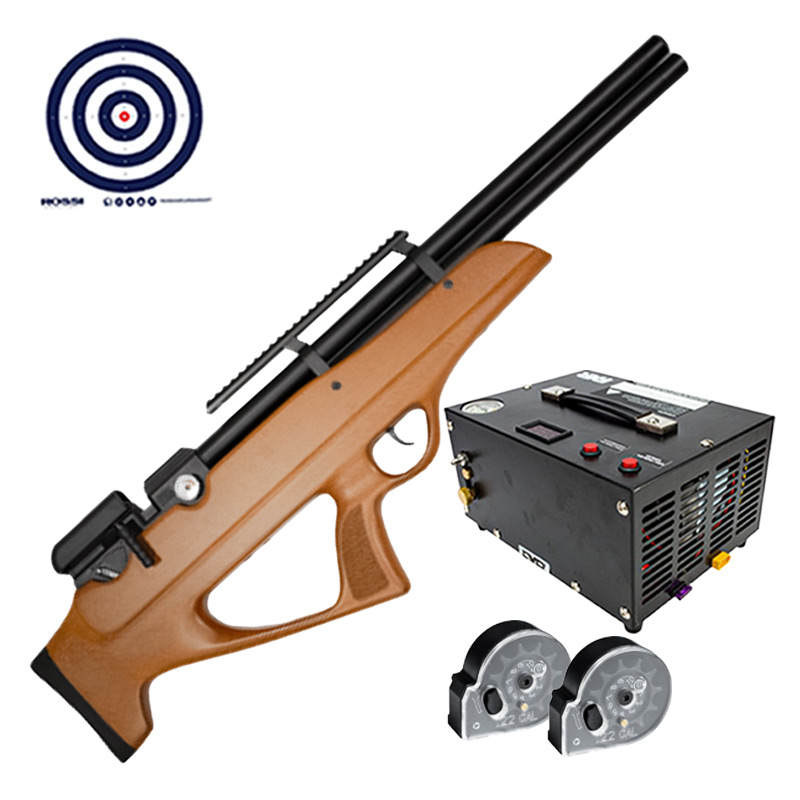 Eleve seu tiro esportivo a um novo patamar com o Kit Carabina PCP Nova Vista Behemoth Bullpup PS-R2-S Wood 5.5mm acompanhado de Compressor Portátil, Magazine Extra e Kit com 30 Alvos Rossi.