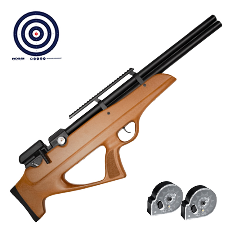 O Kit Carabina PCP Nova Vista Behemoth PS-R2-S Wood 5.5mm com Magazine Extra e 30 Alvos Rossi reúne tudo o que é necessário para uma experiência completa no tiro esportivo.