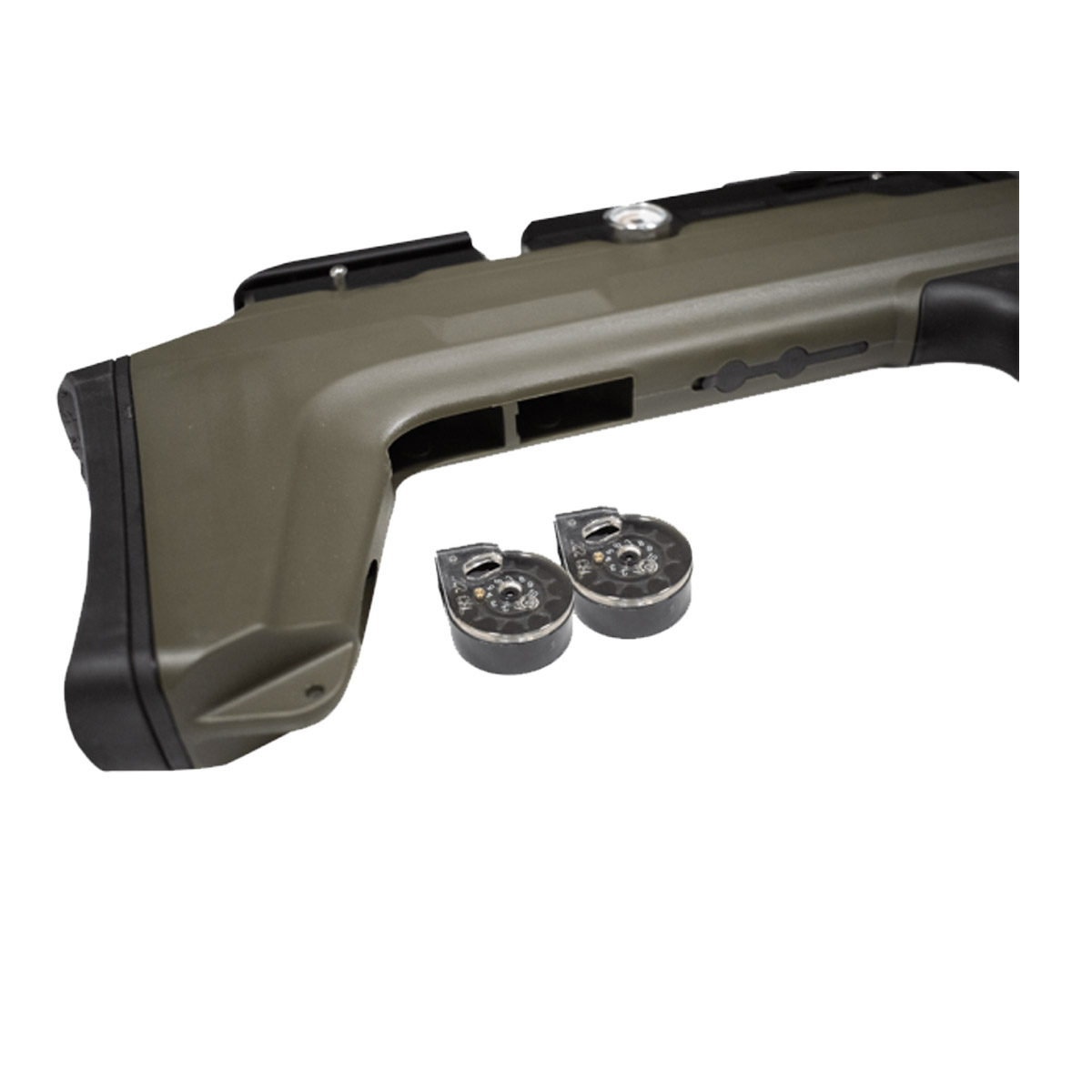 Outro detalhe pensado na praticidade são os dois compartimentos integrados na coronha, projetados especialmente para armazenar os magazines que acompanham a carabina. Assim, você mantém tudo organizado, acessível e protegido durante o uso.