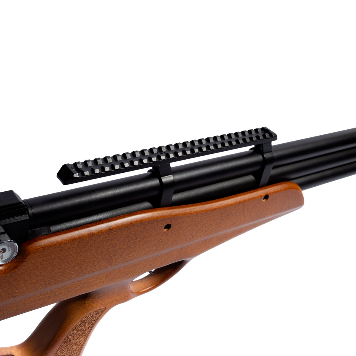 A Behemoth PS-R3 não possui conjunto de mira aberta instalada. Conta com trilho superior de 20 mm, picatinny na parte superior onde você pode instalar uma luneta ou red dot. O uso de uma mira óptica nessa Carabina PCP é indispensável já que ela não possui alça e massa de mira.