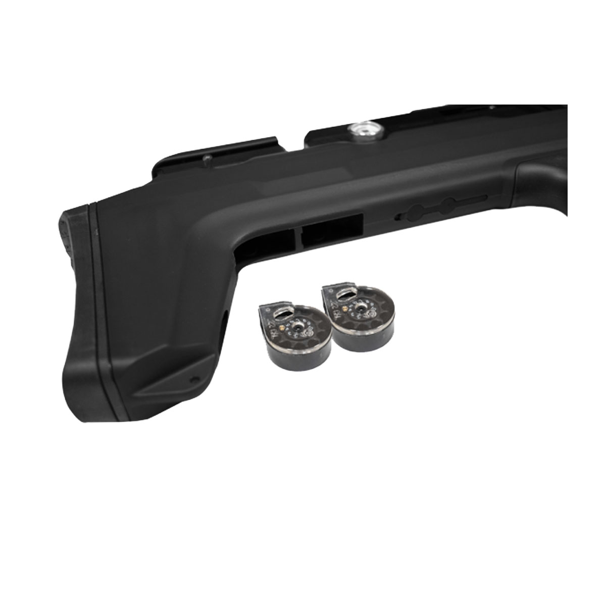 Acompanha 2 magazines rotativos com capacidade para 10 chumbinhos cada.