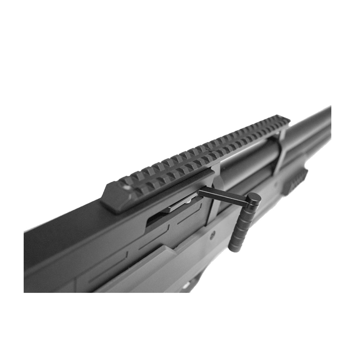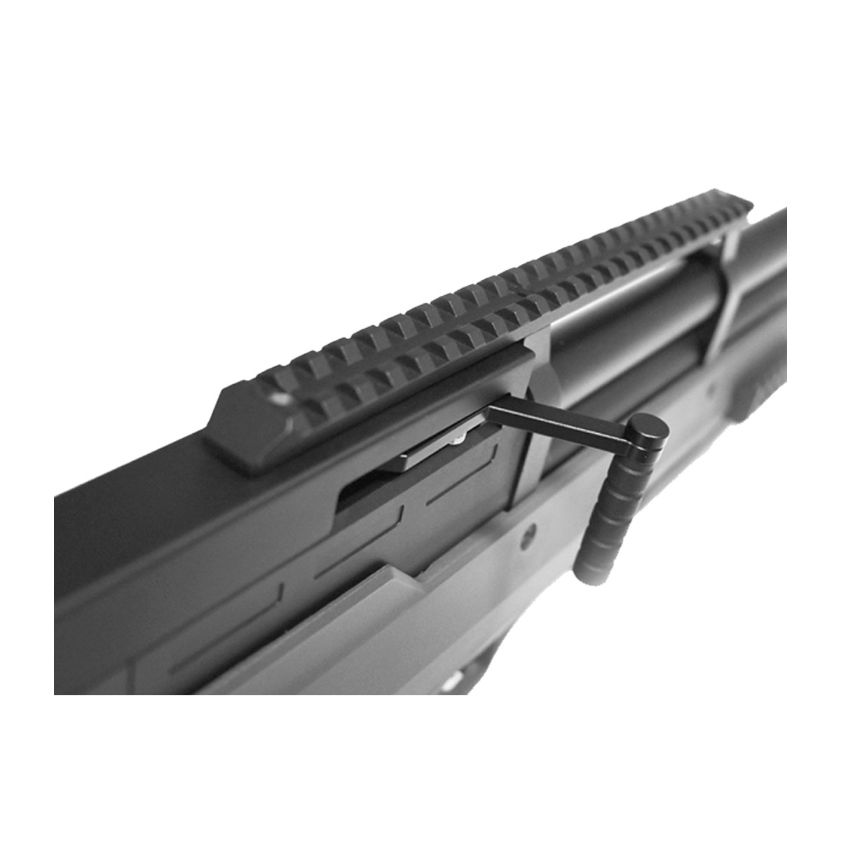 Trilhos picatinny 20 mm na parte superior para luneta, inferior e laterais para bipé.