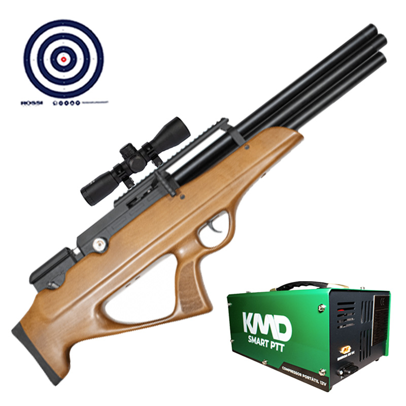 Carabina PCP Nova Vista Bullpup PS-R3-SF Wood 5.5mm + Compressor de AR + Luneta 4x32 + Alvos