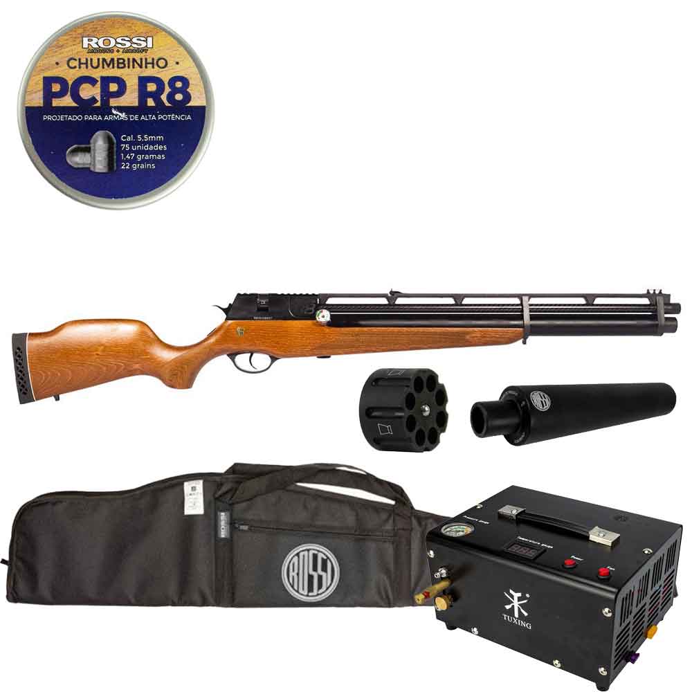 Carabina PCP R8 Madeira VR 5.5mm + Magazine R8 + Chumbinho R8 75Un + Capa + Compressor + Supressor
